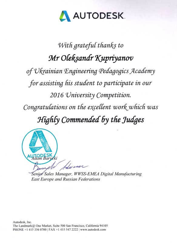 Представлена на студентський конкурс Autodesk робота Проценко Андрія «Проектування і виготовлення деталі типу трійник для трубопроводів АЕС», виконана під керівництвом доц. Купріянов О.В., отримала високу оцінку журі.