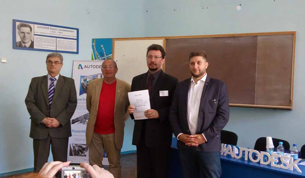 На фото (зліва направо): директор Центру САПР (м.Львів) Олег Борисенко, ректор ЗНТУ проф. Сергій Бєліков, доц. Олександр Купріянов, регіональний (Східна Європа та Росія) менеджер Autodesk Адам Барецький.