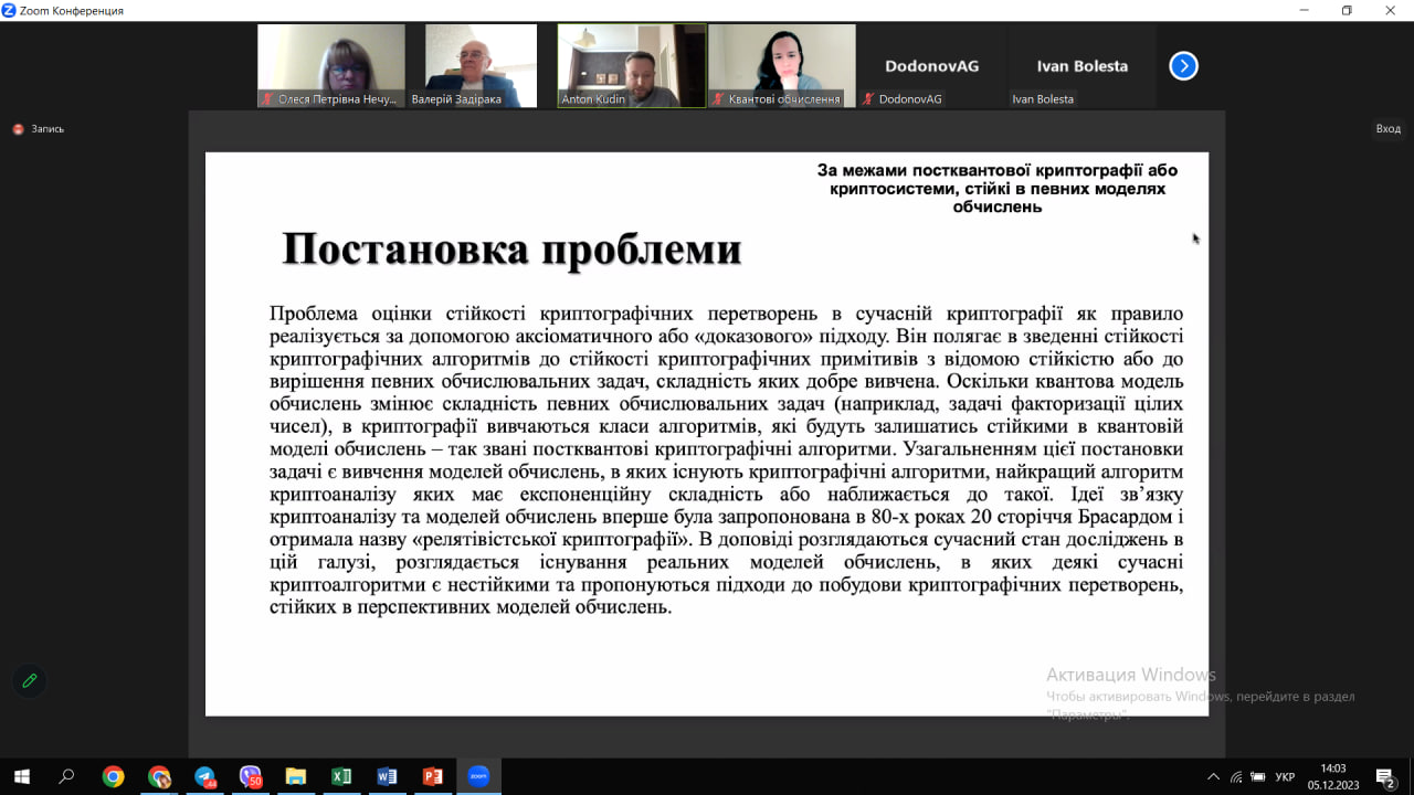 5 грудня 2023 року завідувачка кафедри ІКТіМ О.П. Нечуйвітер взяла участь в роботі Міжнародного наукового семінару «Квантові обчислення», на якому доктором технічних наук А.М. Кудіним (Національний банк України, Навчально-науковий Фізико-технічний інститут КПІ ім. Ігоря Сікорського, м. Київ) була зроблена доповідь на тему «За межами постквантової криптографії або криптосистеми, стійкі в певних моделях обчислень».